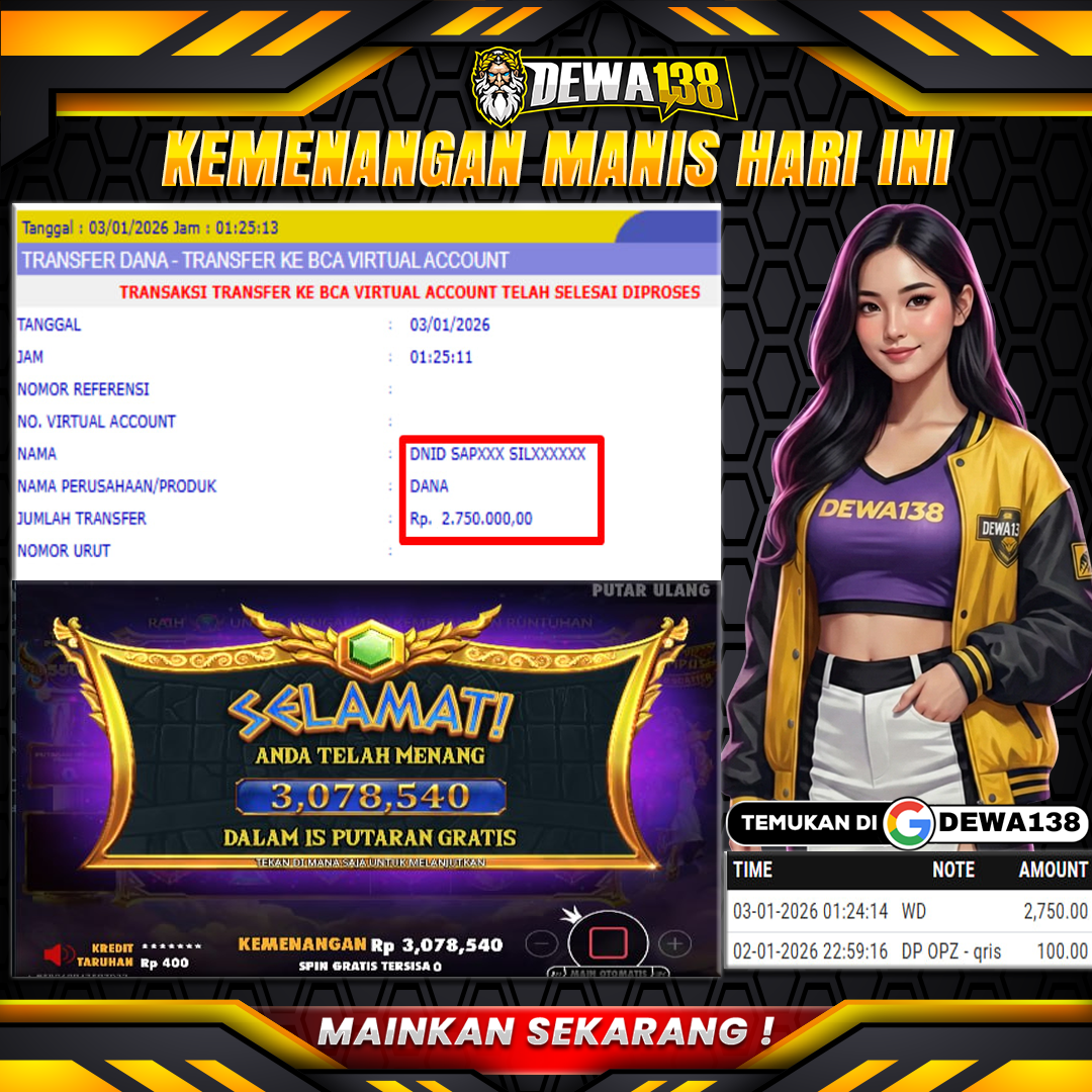 DEWA138 menghadirkan game jackpot vip yang di lengkapi fitur khusus new member hanya dengan modal deposit 100k dijamin akan withdraw 2,7+ juta malam ini.